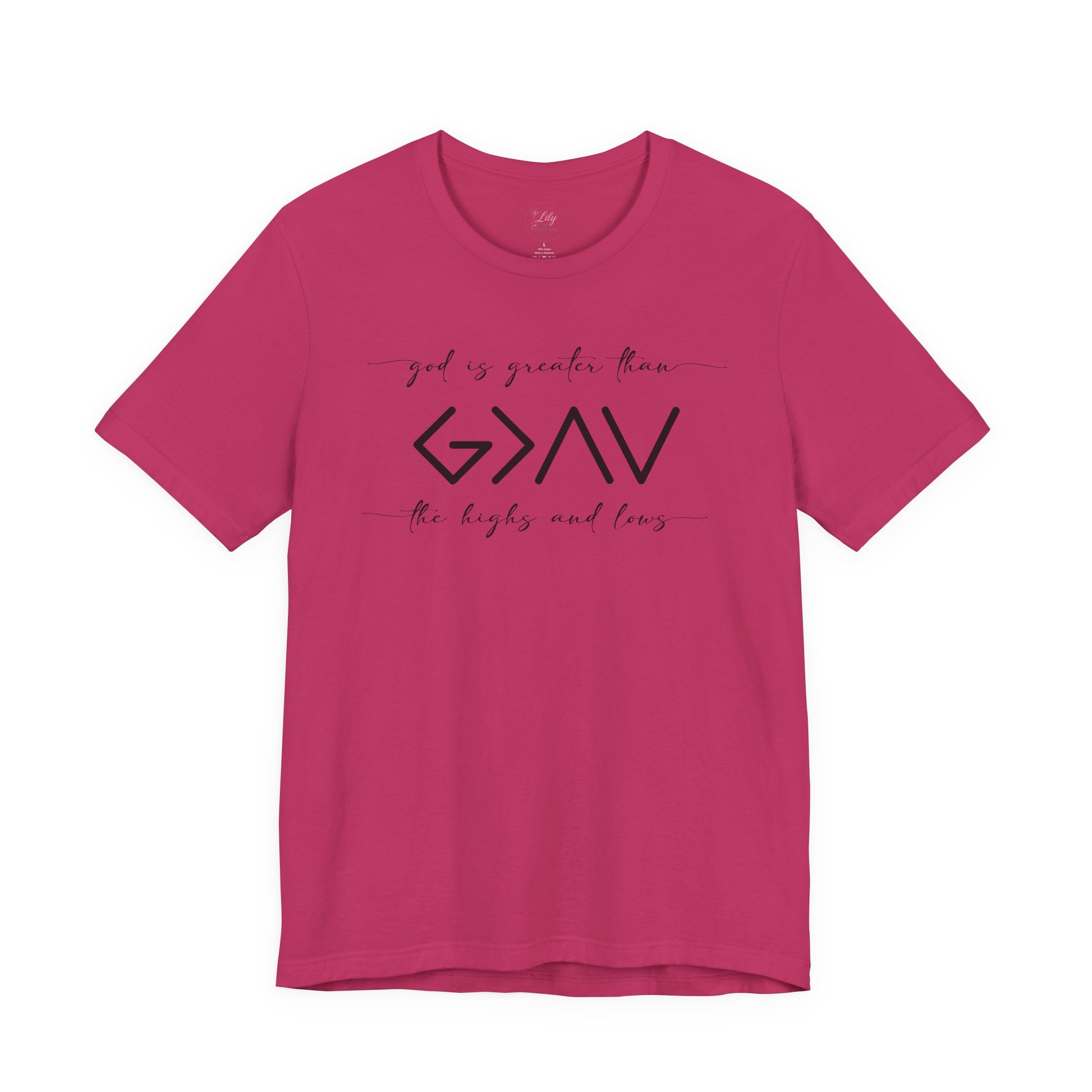 The “God Is Greater Than the Highs and Lows” tee is a powerful reminder that no matter where life takes you, His love, strength, and presence never change.